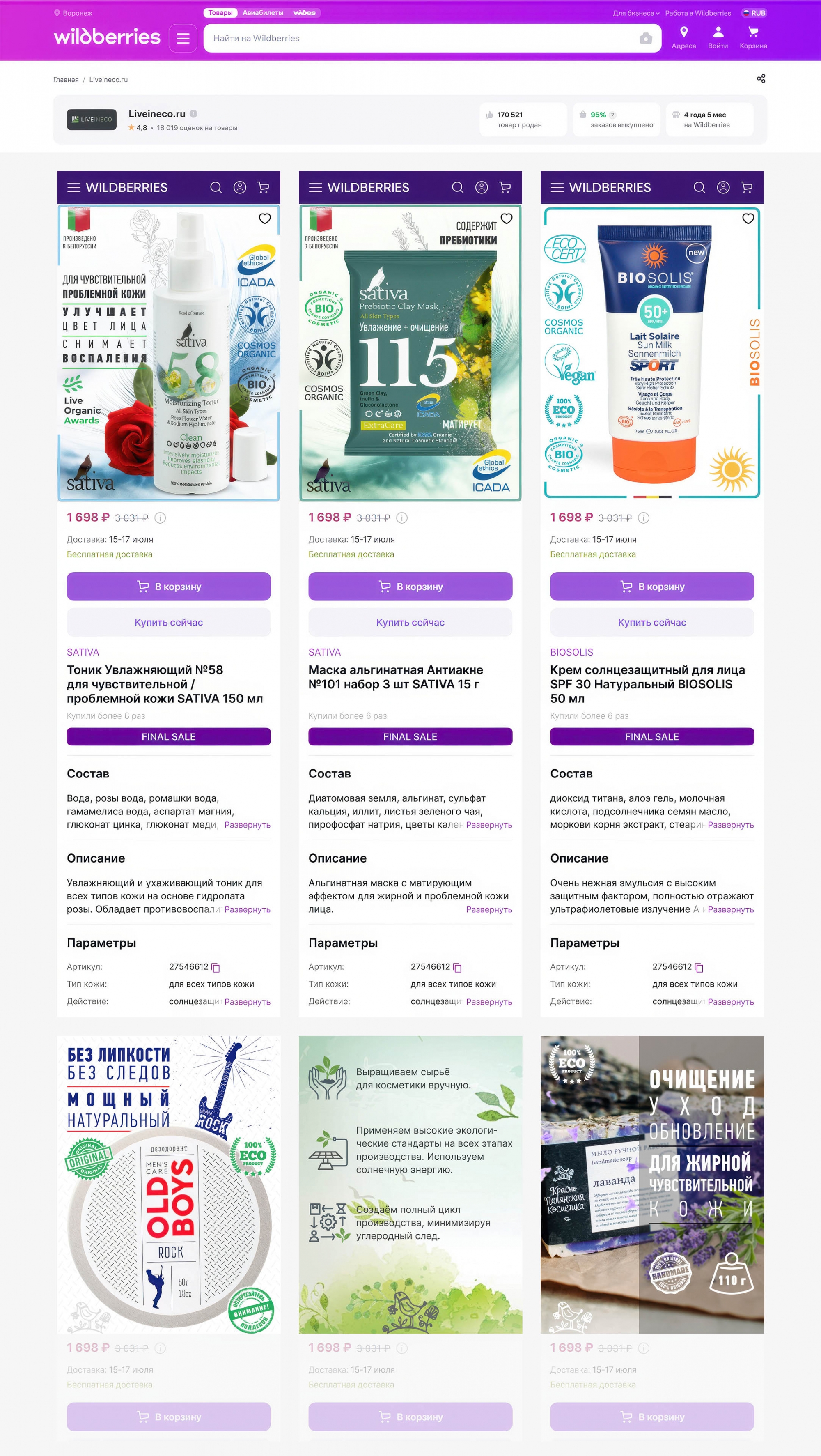 Выполнен спектр услуг. Маркетинг на маркетплейсах Wildberries и Ozon с использованием аналитических инструментов и созданием креативных карточек товаров. Включает разработку описаний и продвижение. Сайт под ключ, а так-же разработка фирменного стиля, дизайна упаковки, логотипа и прочее.